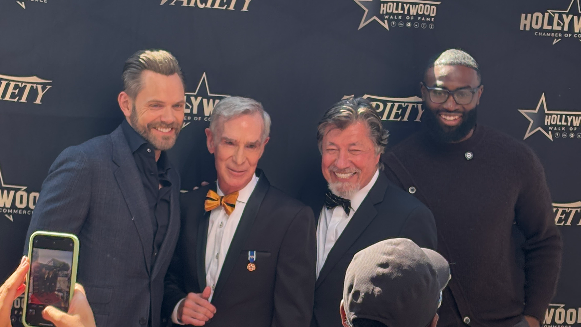 Bill Nye Walk of Fame ceremony speakers Bill Nye stands with Jaylen Brown (professional basketball player for the Boston Celtics), Joel McHale (actor and comedian), and Ross Shafer (comedian and television host). Each spoke in his honor during the unveiling of his star on the Hollywood Walk of Fame. Danielle Gunn / The Planetary Society