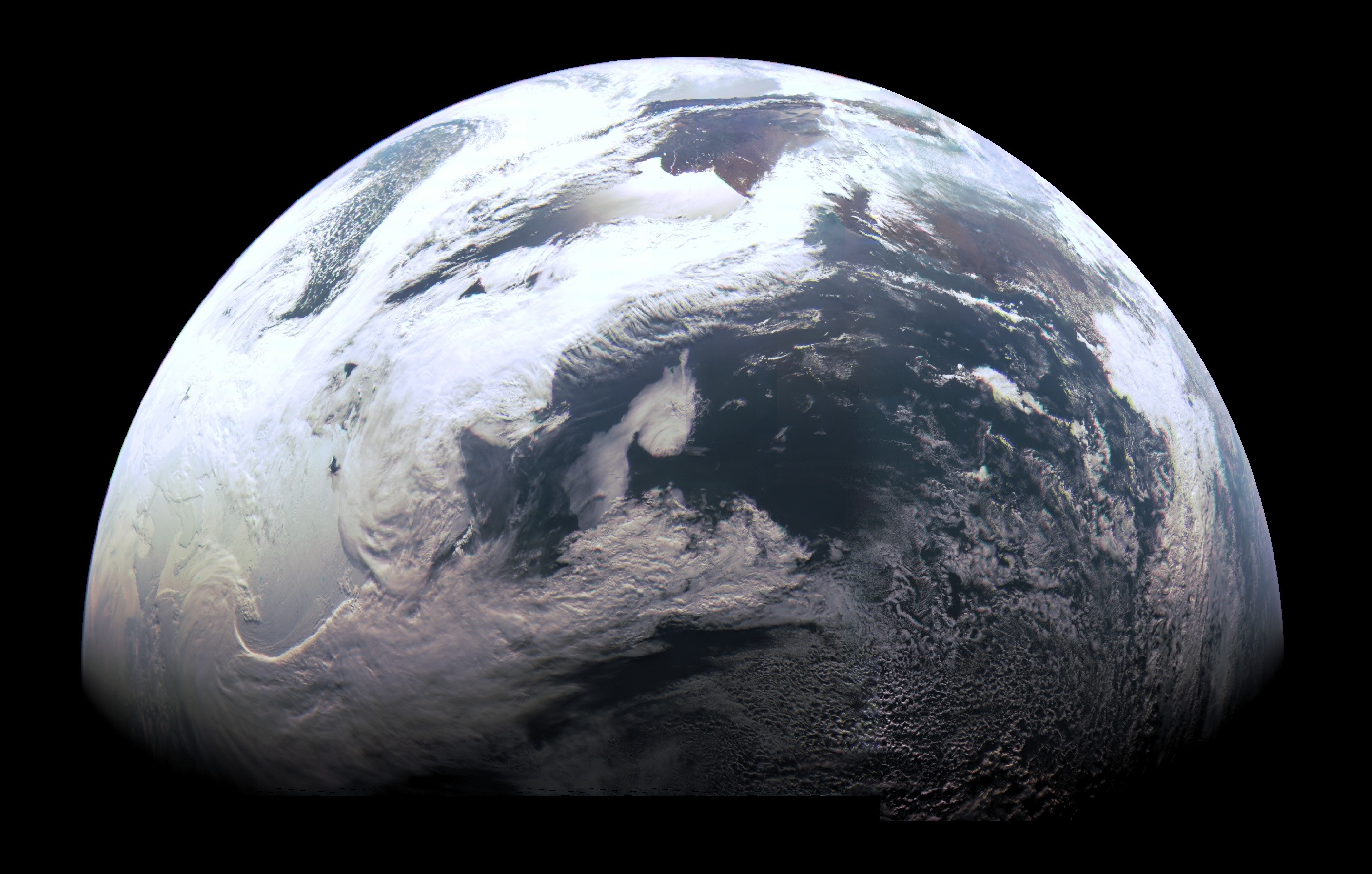 Earth from JunoCam (EFB12) As it flew past Earth, Juno's JunoCam got its first opportunity to image a colorful planet. In this photo, taken on Oct. 9, 2013, the Sun glints from the ocean off the east coast of South America. NASA / JPL / MSSS / Gerald Eichstädt