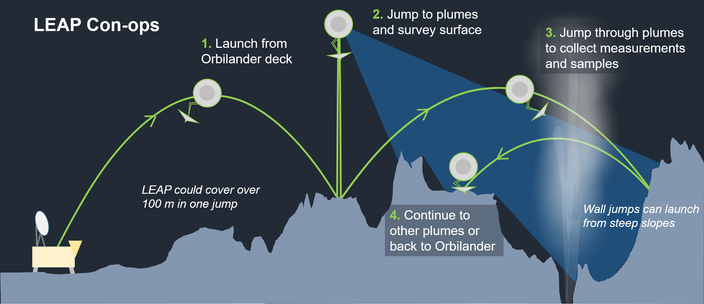 LEAP: Legged Exploration Across the Plume This illustration depicts LEAP: Legged Exploration Across the Plume, a concept presented at the 2025 NASA Innovative Advanced Concepts (NIAC) Symposium. The proposed legged robot would hop across the icy surface of Saturn’s moon Enceladus, leaping through its towering plume jets to collect samples of ocean material ejected from below. LEAP could help scientists search for signs of life and better understand the moon’s hidden subsurface ocean. NASA / Justin Yim