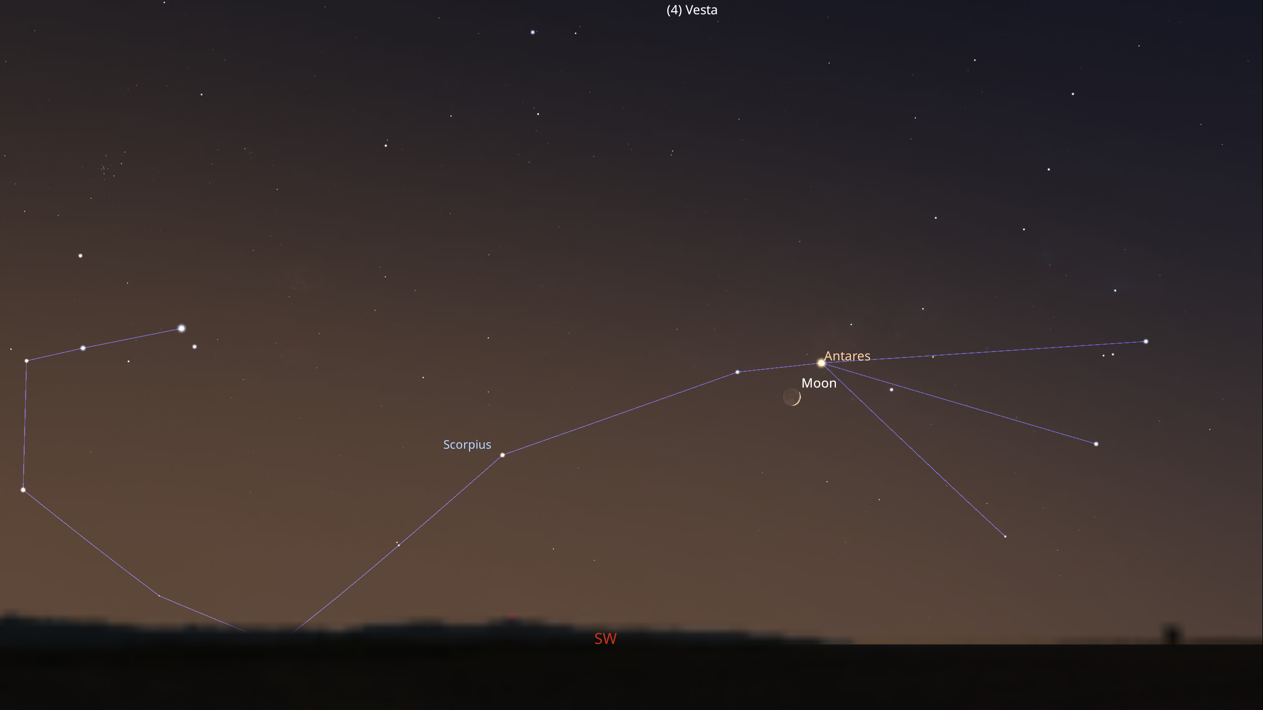 Oct. 24, 2025 night sky snapshot In the evening southwest, the very thin crescent Moon is near the bright red star Antares, the brightest star in the constellation Scorpius. (Pasadena, California. Latitude: about 34 degrees north.) Bruce Betts/The Planetary Society using Stellarium