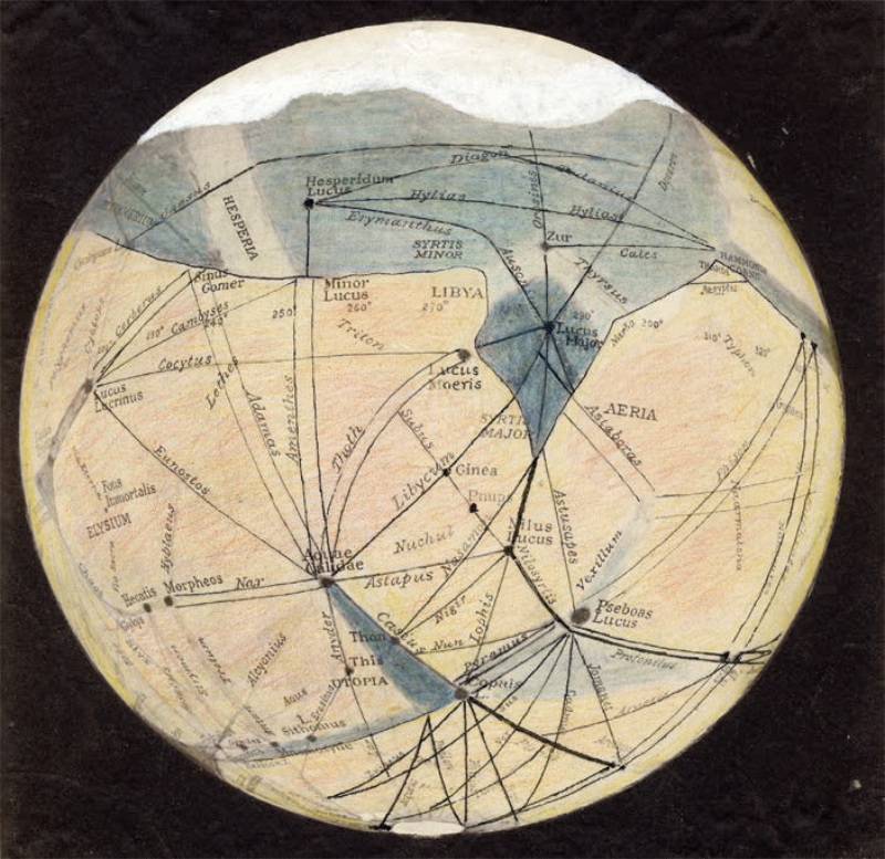 Percival Lowell’s Map of Martian Canals Canals, oases, and meltwater lakes adorn this 1905 map of Mars created by astronomer Percival Lowell. His vivid illustrations inspired generations of speculation about life on the Red Planet. Percival Lowell, Color Drawing of Mars, 1905 / Lowell Observatory Archives