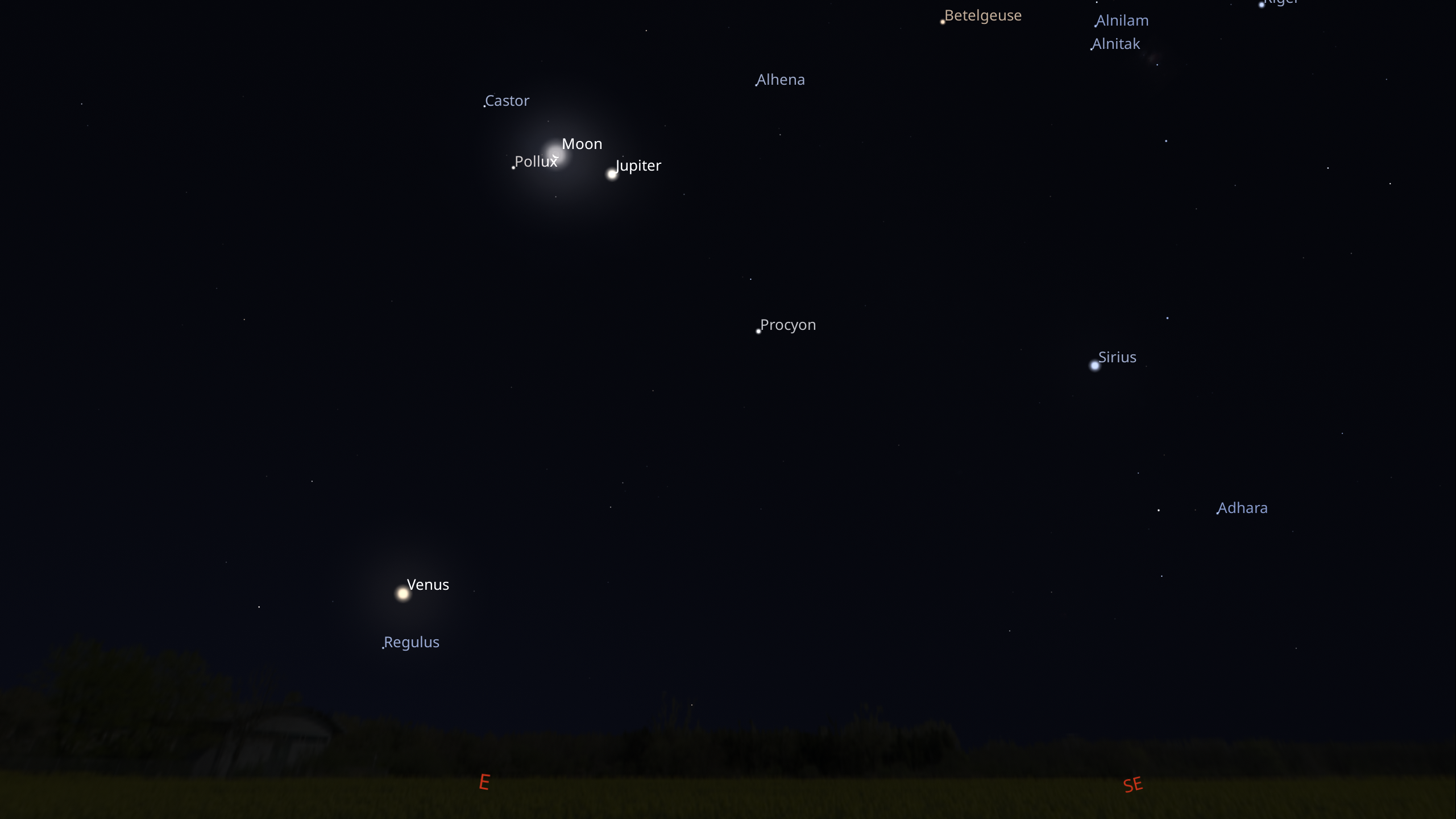 Sept. 16, 2025 night sky snapshot In the predawn east, the Moon is near very bright Jupiter as well as the ‘twin’ stars of Gemini: Pollux and Castor. Lots of other bright stars can also be seen in this general part of the sky, including the brightest nighttime star, Sirius. (Pasadena, California. Latitude: about 34 degrees north.) Bruce Betts/The Planetary Society using Stellarium
