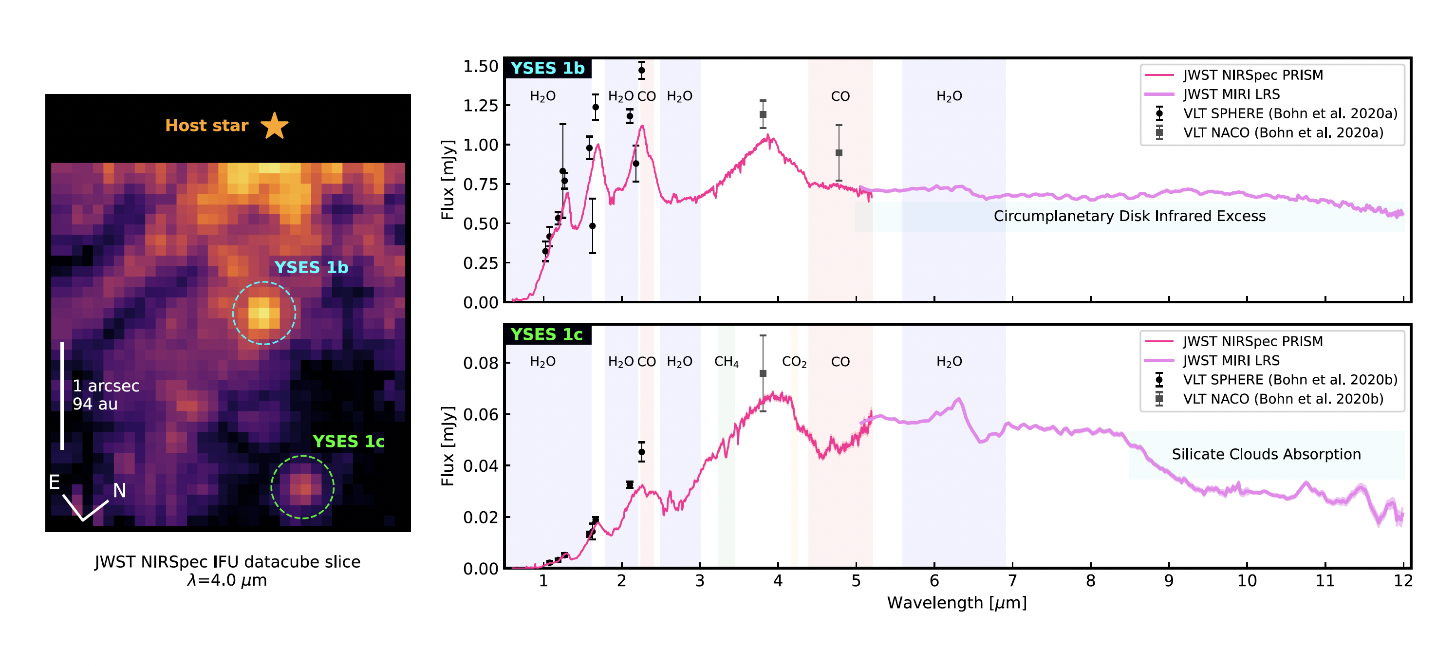 Spectra from the YSES-1 system This graphic from the paper “Silicate clouds and a circumplanetary disk in the YSES-1 exoplanet system” shows the James Webb Space Telescope spectra of the two giant exoplanets in the YSES-1 system. On the left is a direct image of the system captured by JWST's MIRI instrument, with YSES-1b and YSES-1c labeled. On the right, the two planetary spectra are shown: YSES-1b (top) reveals thermal emission from a dusty circumplanetary disk, while YSES-1c (bottom) shows prominent silicate cloud features in its atmosphere. These observations offer a rare glimpse into the atmospheres and environments of forming gas giants around a Sun-like star. Ellis Bogat