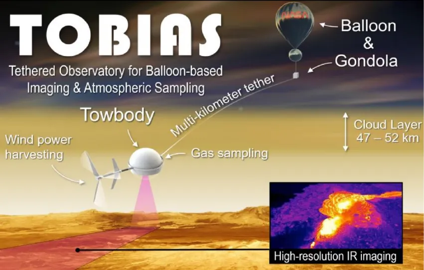 TOBIAS (Tethered Balloon Imaging and Atmospheric Sampling) This illustration shows TOBIAS, or Tethered Balloon Imaging and Atmospheric Sampling, a concept presented at the 2025 NASA Innovative Advanced Concepts (NIAC) Symposium. The proposed mission would suspend a basketball-sized instrument package beneath a high-altitude balloon in Venus’s atmosphere, using a long tether to capture detailed images of the planet’s surface and analyze its atmosphere. By harnessing wind power and innovative cooling systems, TOBIAS could provide a stable, long-term platform for studying Venus’s geology and climate from within its clouds. NASA / Ben Hockman